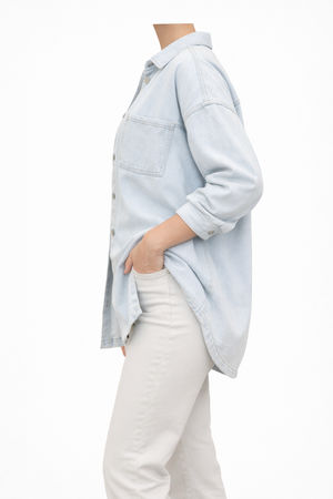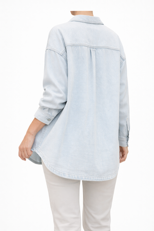 Designed with a classic button-down front and two chest pockets, it offers subtle detail while maintaining a clean, elegant style. The soft denim fabric ensures all-day comfort, making it perfect to wear buttoned up as a blouse or open over a top for a layered look.